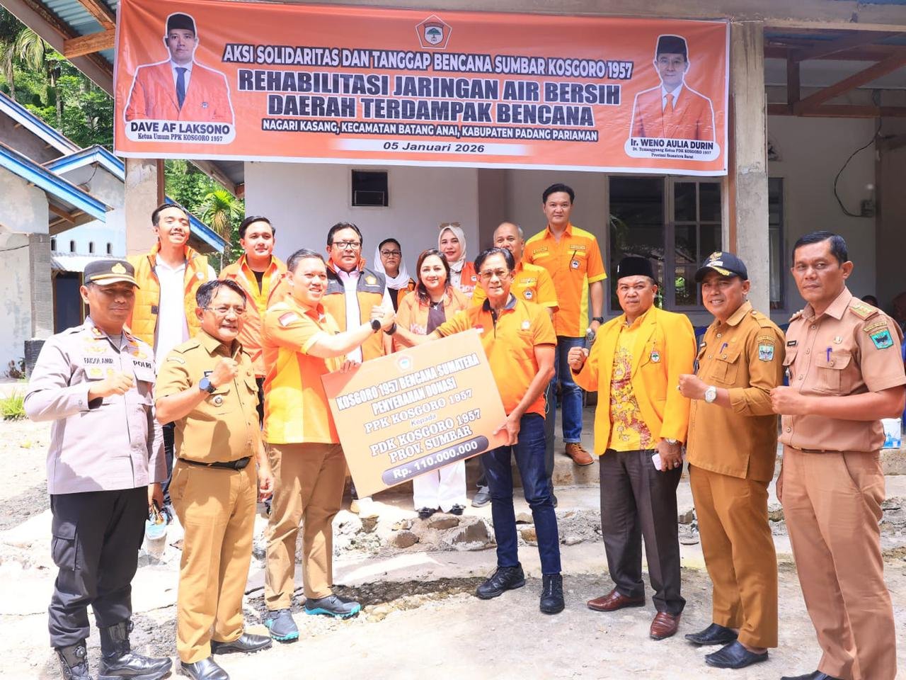 Rombongan Kosgoro 1957 tiba di Padang Pariaman dipimpin Ketua Umum Pimpinan Pusat Kolektif (PPK) Kosgoro 1957, Dave AF Laksono, didampingi Ketua Pimpinan Daerah Kolektif (PDK) Kosgoro 1957 Provinsi Sumatera Barat, Ir. Weno Aulia Durin Dt. Tumangguang, bersama jajaran pengurus pusat dan daerah.