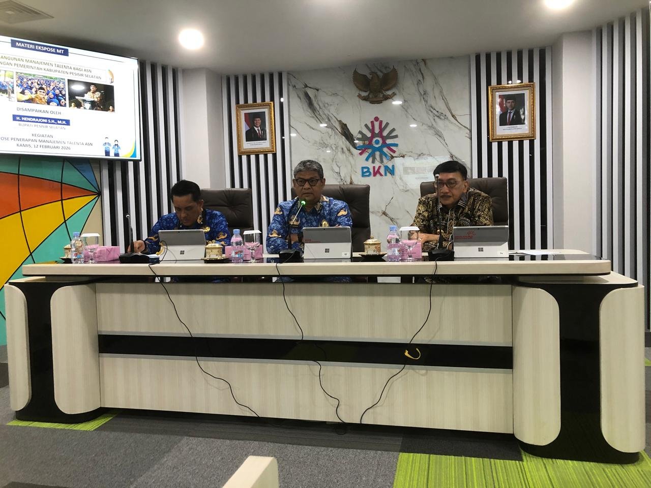 Bupati Pesisir Selatan Hendrajoni, S.H, M.H didampingi Sekretaris Daerah H. Zainal Arifin, S.K.M, M.K.M dan Kepala BKPSDM Yoski Wandri, S.Pi., M.Si, melakukan ekspose pembangunan Manajemen Talenta Aparatur Sipil Negara (ASN) di hadapan jajaran Badan Kepegawaian Negara (BKN) di Jakarta. Rombongan Pemkab Pessel diterima Wakil Kepala BKN Suharmen, S.Kom, M.Si.