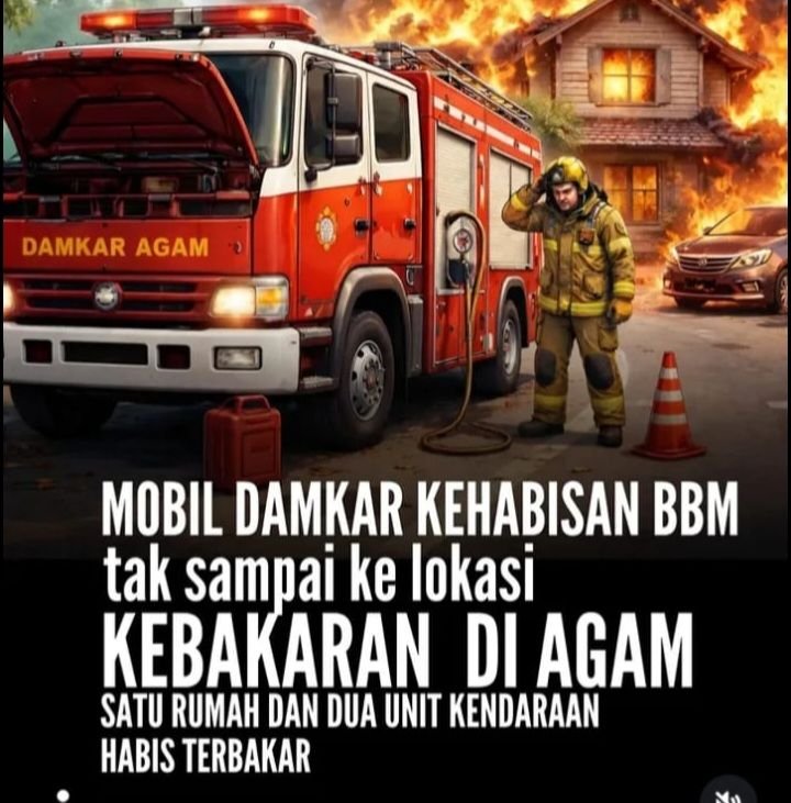 HE, HE, HE, Armada DAMKAR Agam Kehabisan BBM. Khabar ini tidak lucu, tapi menyayat hati. Masa iya, armada Pemadam Kebakaran (DAMKAR) Kabupaten Agam, Sumatera Barat, kehabisan Bahan Bakar Minyak (BBM) dalam perjalanan menuju Tempat Kejadian Peristiwa (TKP) Kamis (2/4/2026) di Jorong Ateh, Nagari Koto Gadang, Kecamatan Tanjung Raya, Agam.