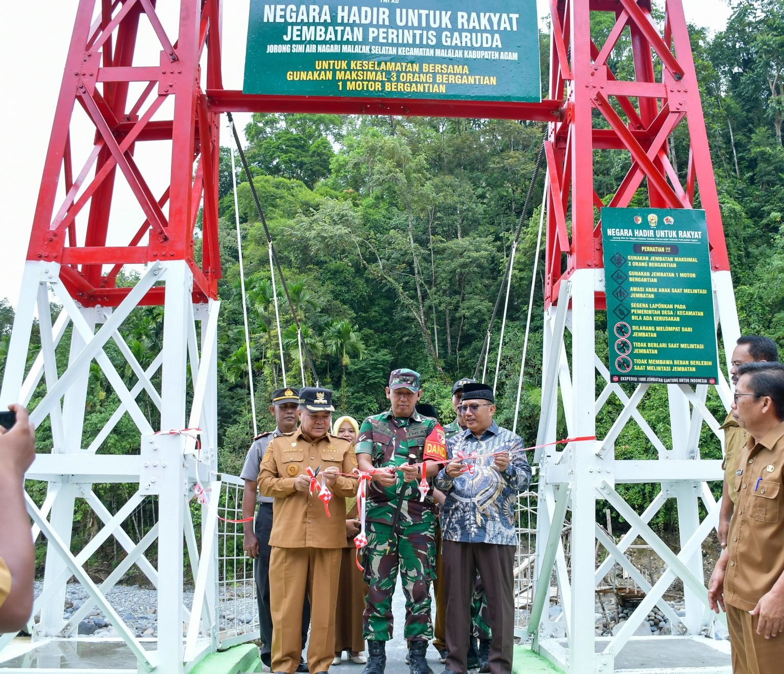 AGAM, marapipost.com-Bupati Agam, Sumatera Barat, Benni Warlis, bersama Dandim 0304 Agam, Slamet Dwi Santoso, Anggota DPRD Kabupaten Agam, Erdinal Datuak Marajo, Selasa (21/4/2026) resmian Jembatan Gantung Perintis Garuda, di Jorong Sini Aia, Nagari Malalak Selatan, Kecamatan Malalak, Kabupaten Agam.